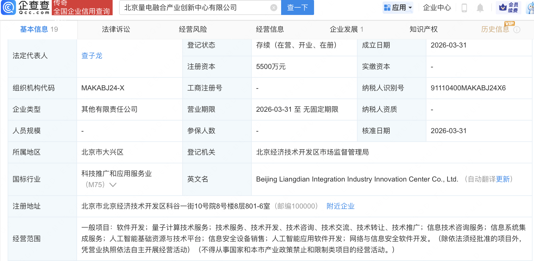 企查查APP显示,近日,北京量电融合产业创新中心有限公司成立,注册资本5500万元,经营范围包含:量子计算技术服务;人工智能应用软件开发;网络与信息安全软件开发等。企查查股权穿透显示,该公司由中国电信(601728)全资子公司中电信量子信息科技集团有限公司、中兴通讯(000063)、摩尔线程(688795)全资子公司北京摩笔生成科技有限公司等共同持股。