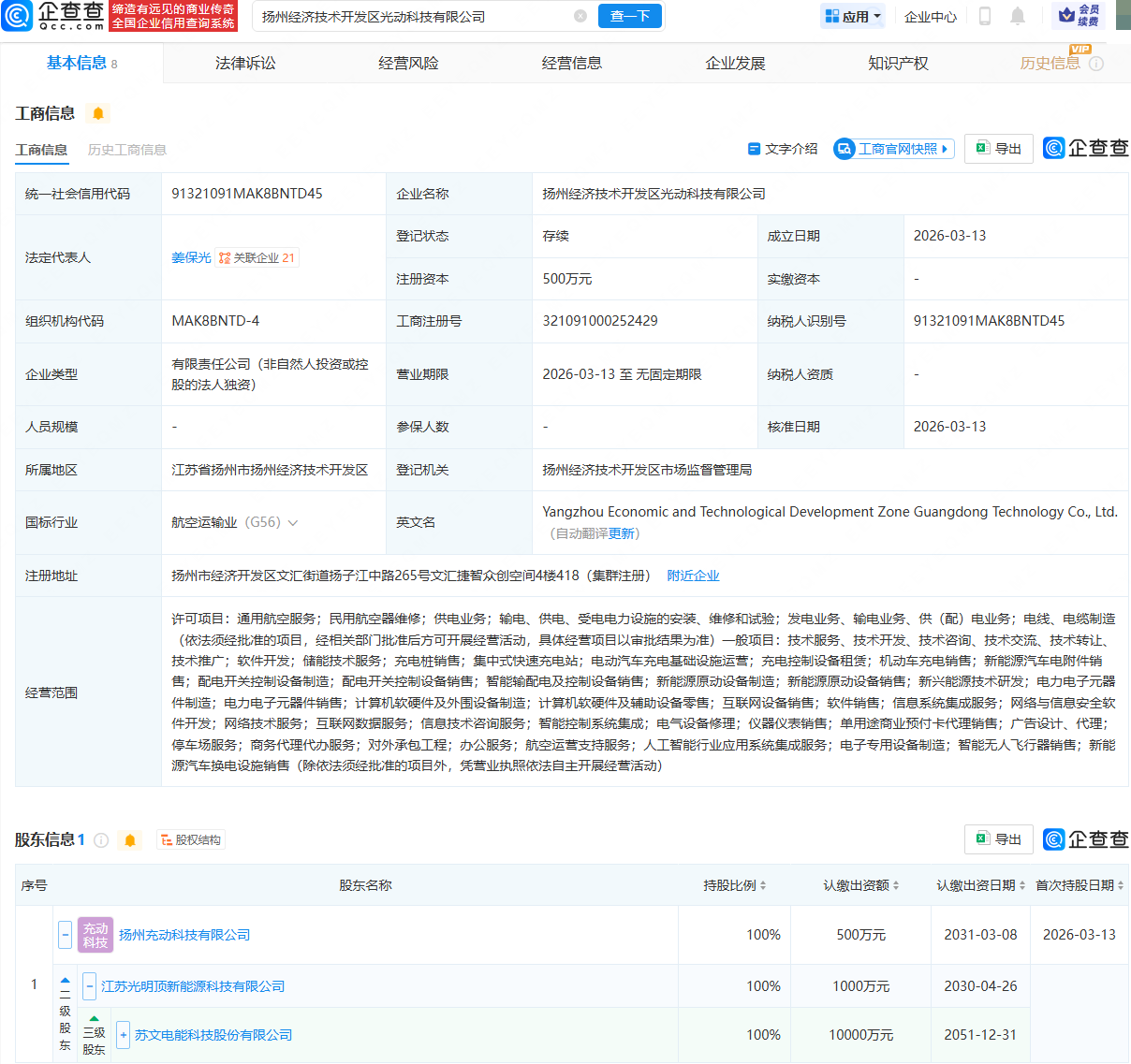 企查查APP显示,近日,扬州经济技术开发区光动科技有限公司成立,法定代表人为姜保光,经营范围包含:通用航空服务;民用航空器维修;供电业务;集中式快速充电站;智能无人飞行器销售等。企查查股权穿透显示,该公司由苏文电能(300982)间接全资持股。