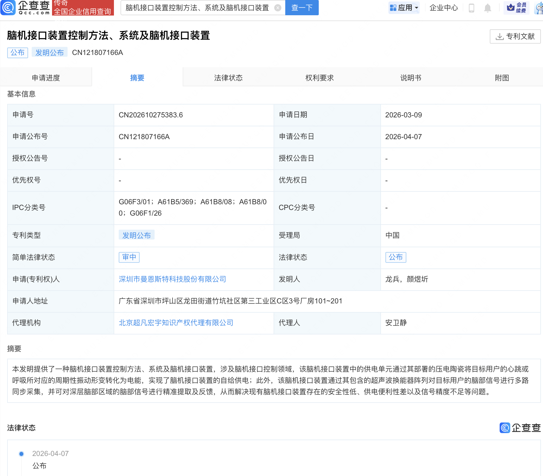 企查查APP显示,近日,曼恩斯特(301325)“脑机接口装置控制方法、系统及脑机接口装置”专利公布。企查查专利摘要显示,本发明涉及脑机接口控制领域,该脑机接口装置中的供电单元通过其部署的压电陶瓷将目标用户的心跳或呼吸所对应的周期性振动形变转化为电能,实现了脑机接口装置的自给供电;此外,该脑机接口装置通过其包含的超声波换能器阵列对目标用户的脑部信号进行多路同步采集,并可对深层脑部区域的脑部信号进行精准提取及反馈,从而解决现有脑机接口装置存在的安全性低、供电便利性差以及信号精度不足等问题。