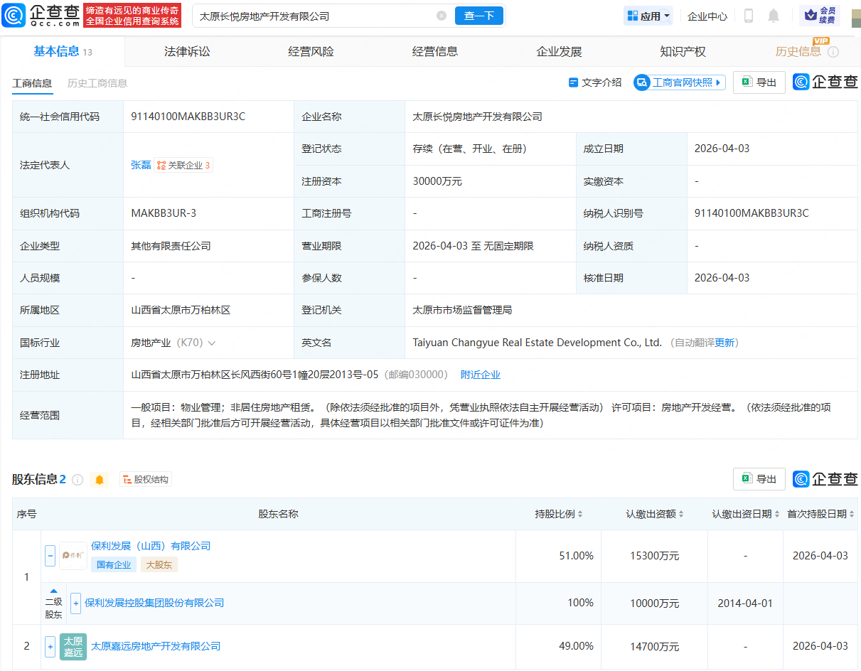 企查查APP显示,近日,太原长悦房地产开发有限公司成立,法定代表人为张磊,注册资本为3亿元,经营范围包含:物业管理;非居住房地产租赁;房地产开发经营。企查查股权穿透显示,该公司由保利发展(600048)全资子公司保利发展(山西)有限公司、太原嘉远房地产开发有限公司共同持股。