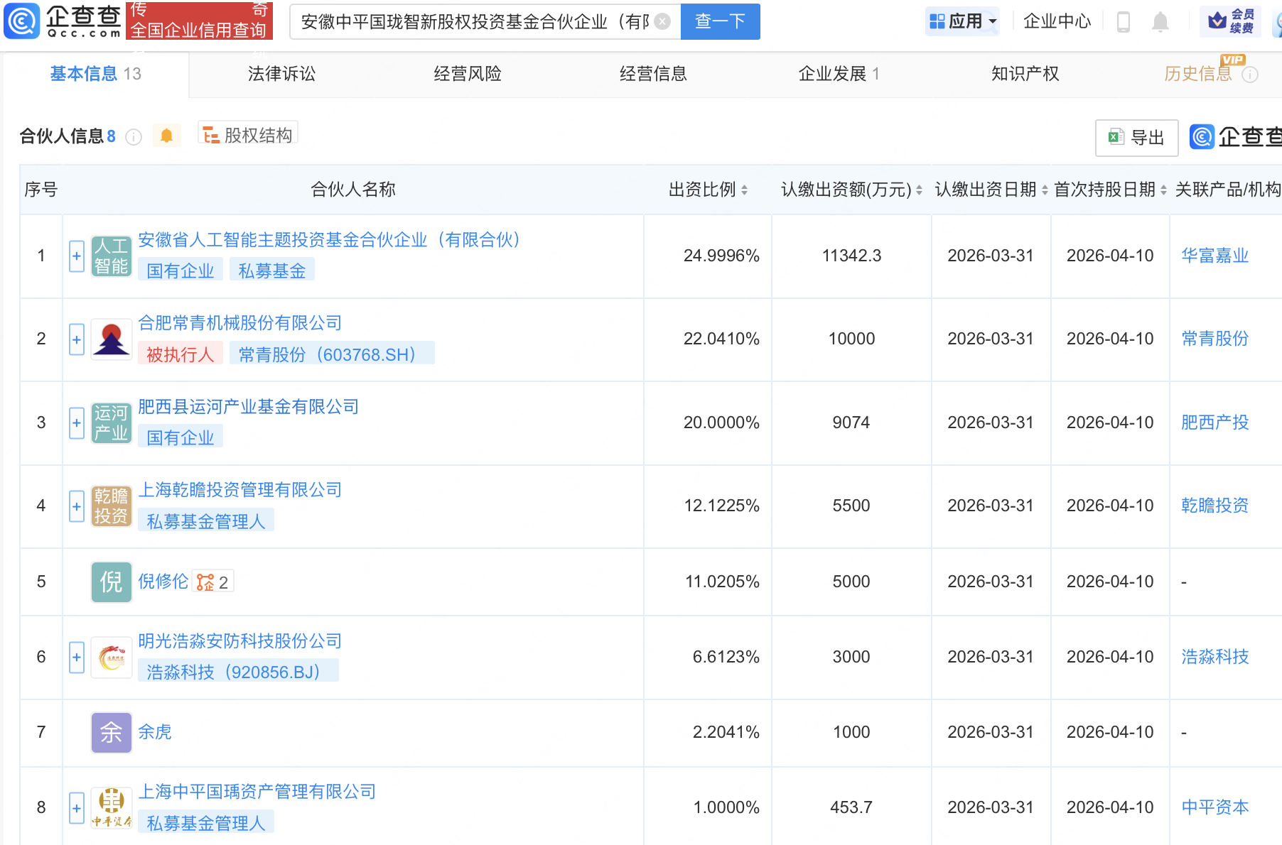 企查查APP显示,近日,安徽中平国珑智新股权投资基金合伙企业(有限合伙)成立,出资额4.54亿元,经营范围包含:以私募基金从事股权投资、投资管理、资产管理等活动。企查查股权穿透显示,该企业由常青股份(603768)、浩淼科技(920856)等共同出资。