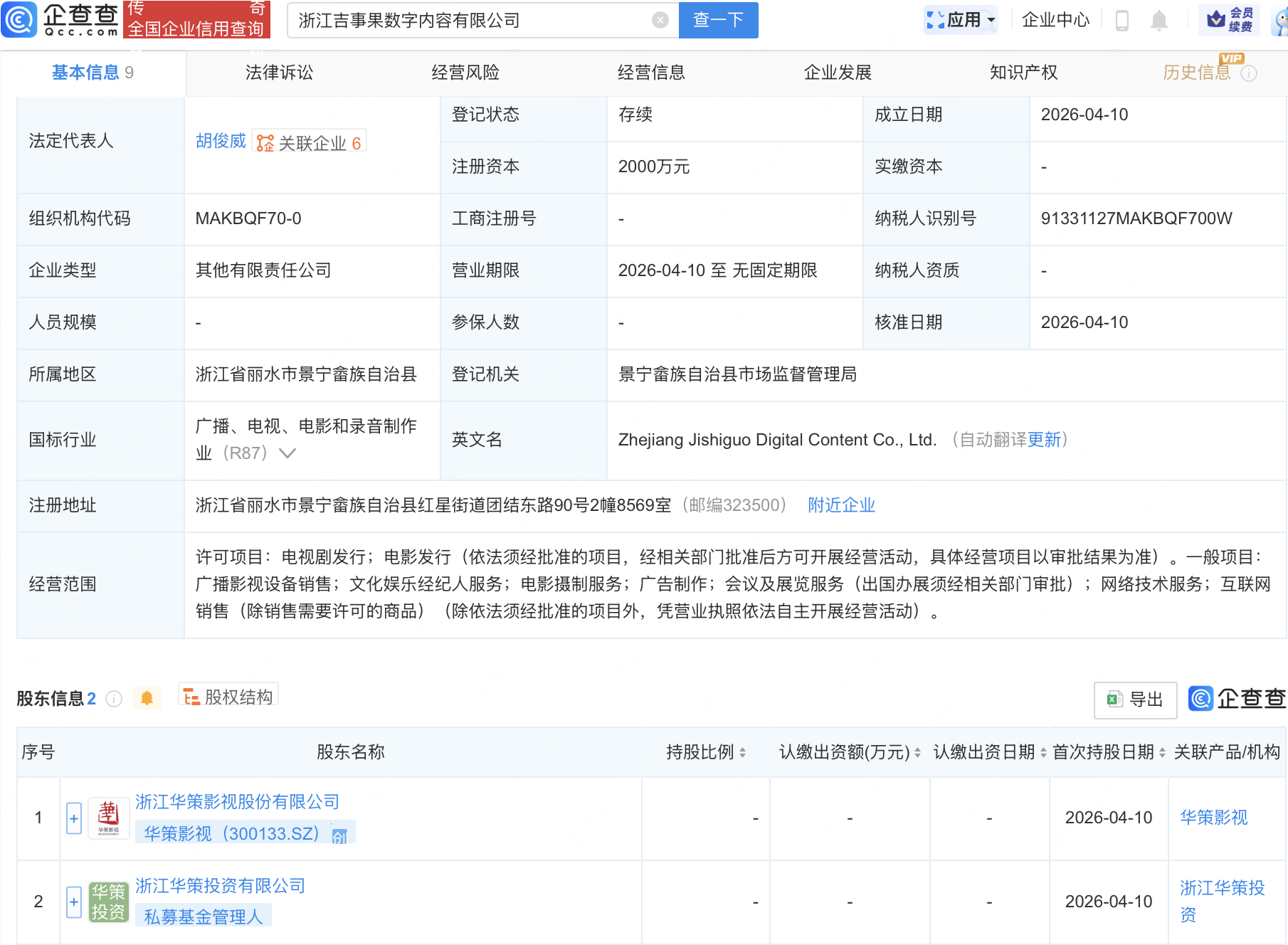 企查查APP显示,近日,浙江吉事果数字内容有限公司成立,注册资本2000万元,经营范围包含:广播影视设备销售;文化娱乐经纪人服务;电影摄制服务;广告制作等。企查查股权穿透显示,该公司由华策影视(300133)等共同持股。