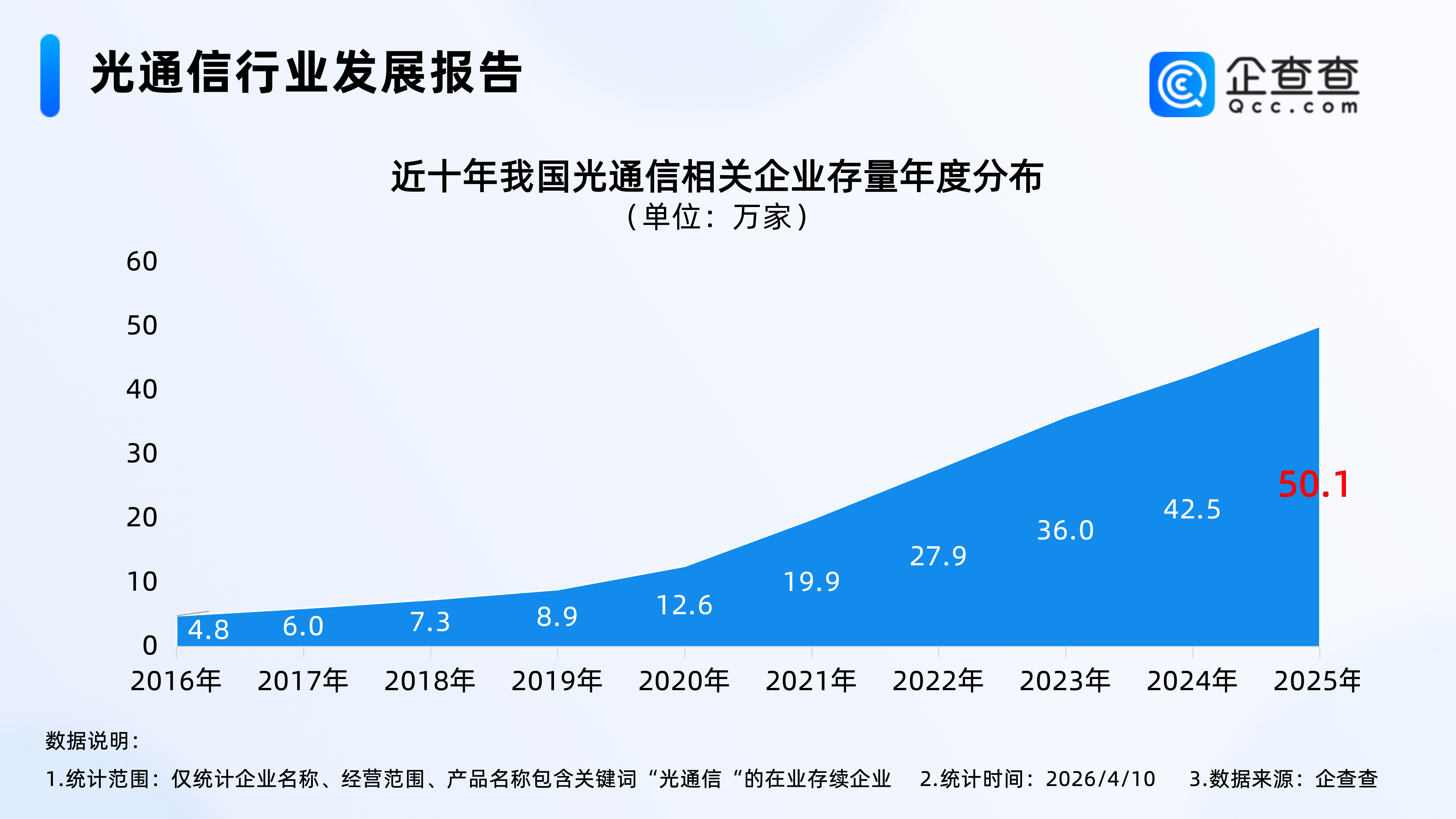 企查查数据显示,2021年开始,我国光通信相关企业存量增速加快,2025年年底,我国在业存续50.1万家光通信相关企业;截至2026年4月10日,我国现存51.6万家光通信相关企业。