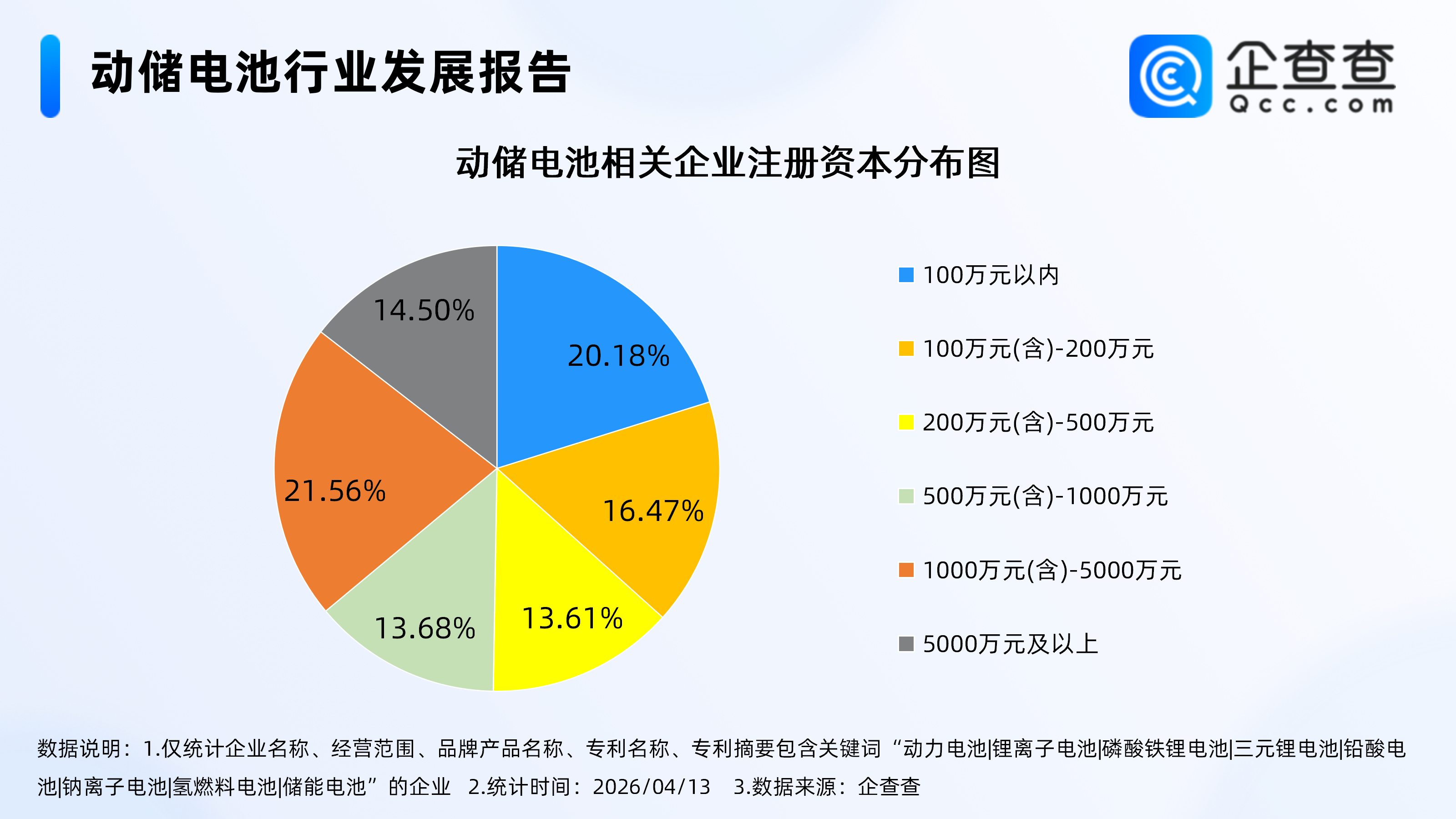 企查查数据显示,截至4月13日,国内现存动储电池相关企业1.39万家。从成立年限分布来看,动储电池相关企业多为成熟企业,成立5-10年的企业占比最高,达64.24%,成立10年以上的企业占比27.41%。注册量方面,2025年全年注册93家相关企业,截至目前,今年已注册20家。