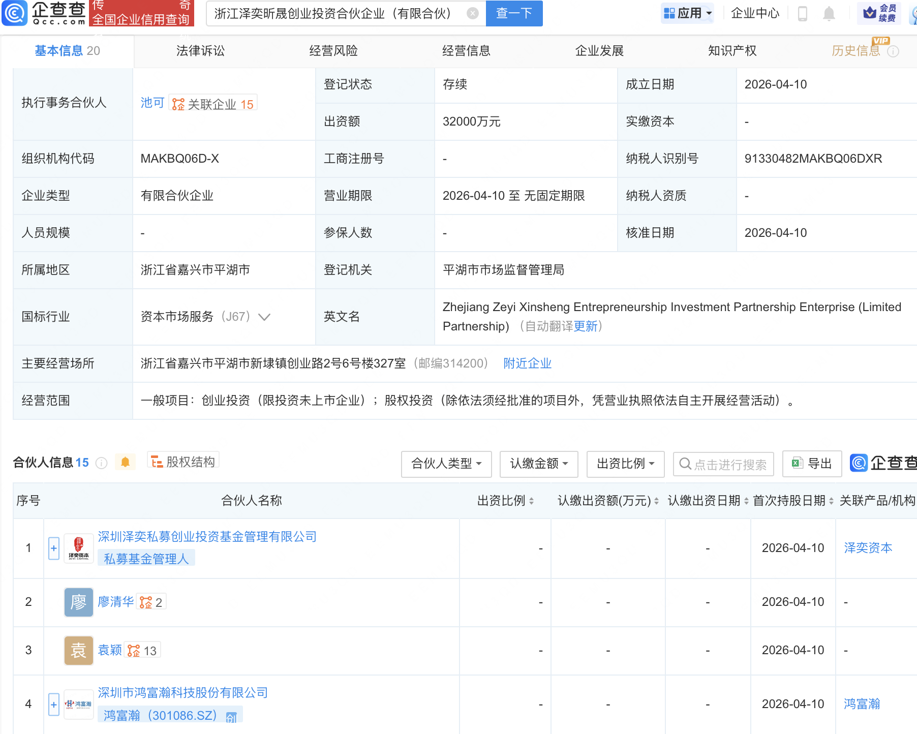 企查查APP显示,近日,浙江泽奕昕晟创业投资合伙企业(有限合伙)成立,出资额3.2亿元,经营范围包含:创业投资(限投资未上市企业);股权投资。企查查股权穿透显示,该企业由鸿富瀚(301086)等共同出资。