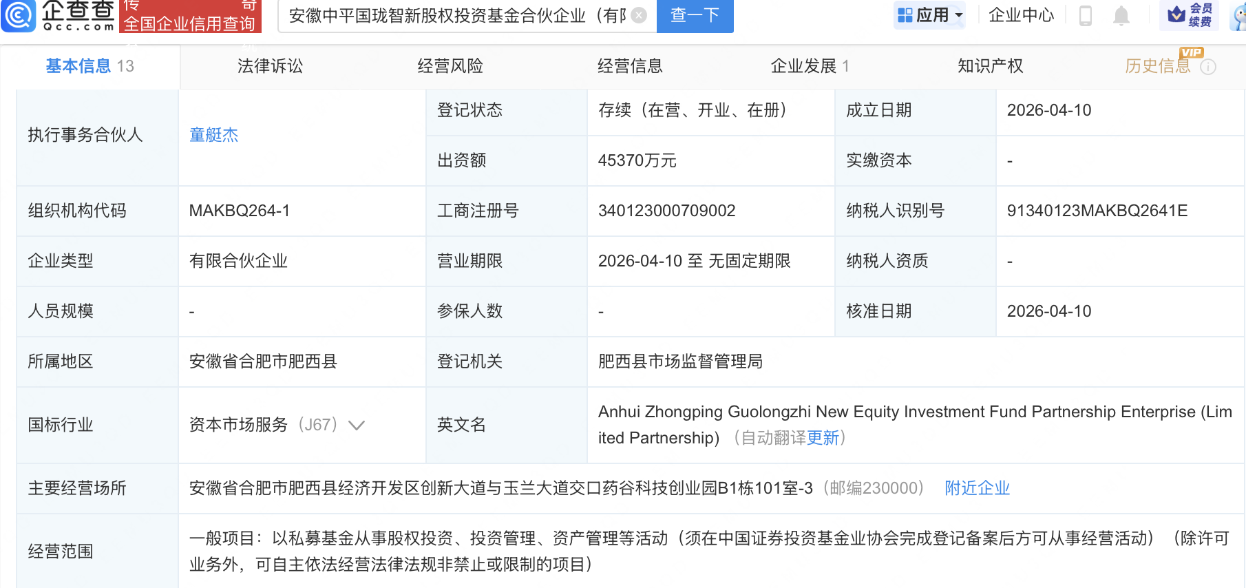企查查APP显示,近日,安徽中平国珑智新股权投资基金合伙企业(有限合伙)成立,出资额4.54亿元,经营范围包含:以私募基金从事股权投资、投资管理、资产管理等活动。企查查股权穿透显示,该企业由常青股份(603768)、浩淼科技(920856)等共同出资。