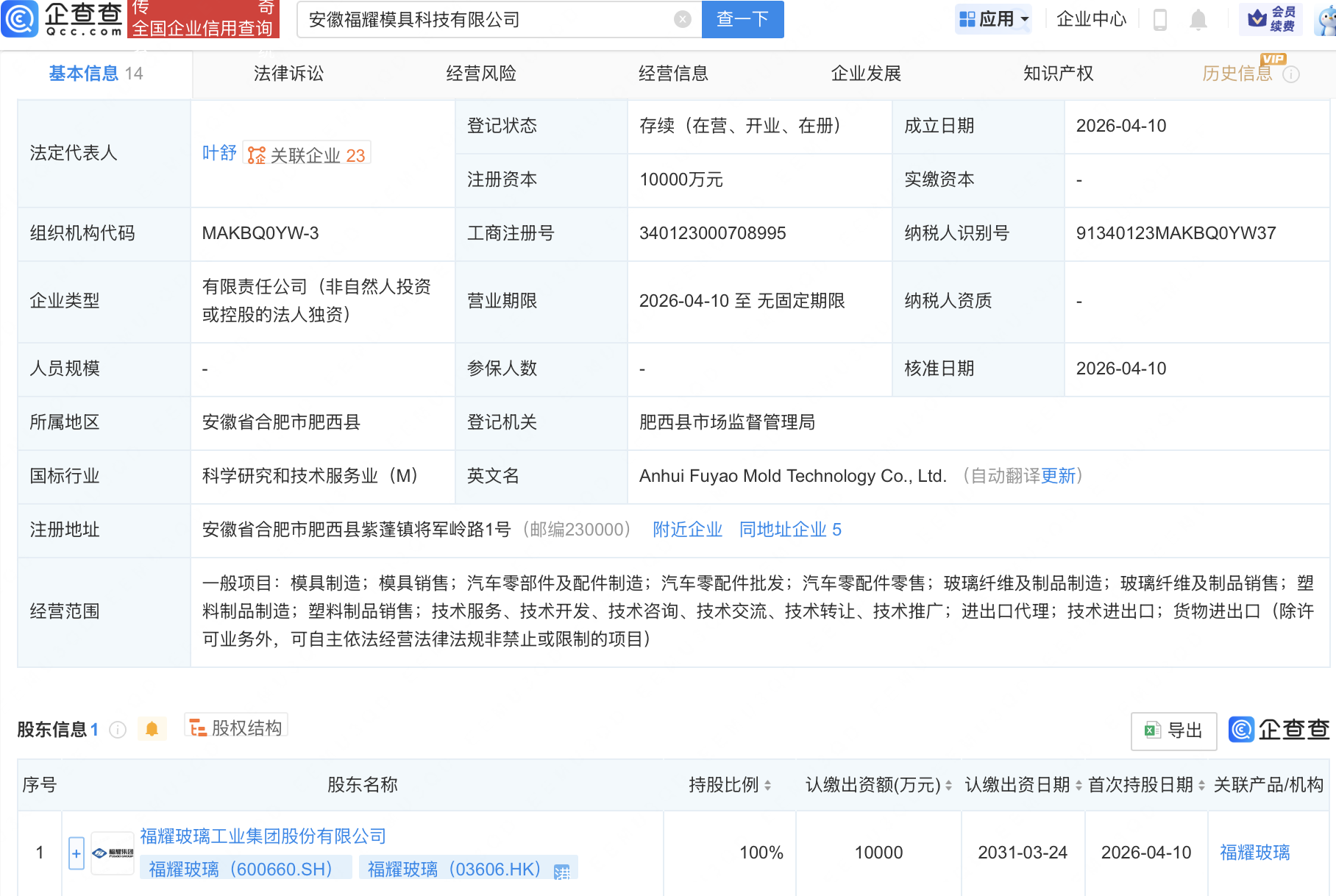 企查查APP显示,近日,安徽福耀模具科技有限公司成立,注册资本1亿元,经营范围包含:模具制造;模具销售;汽车零部件及配件制造;汽车零配件批发等。企查查股权穿透显示,该公司由福耀玻璃(600660)全资持股。
