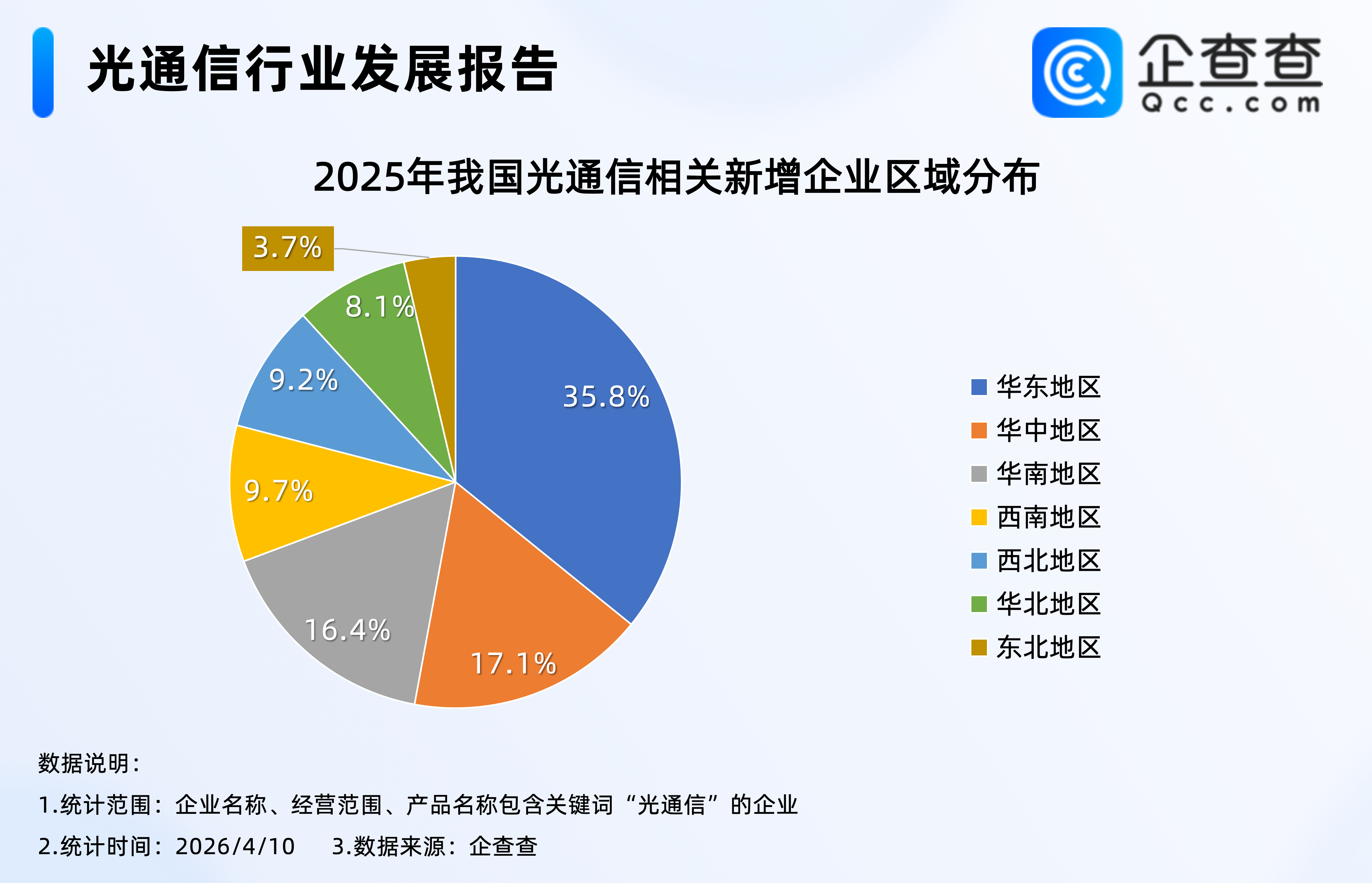 企查查数据显示,2025年新注册的11.6万家光通信相关企业中,超三成位于华东地区,占比35.8%,其次是华中地区,占比17.1%,东北地区相对最少,占比3.7%。