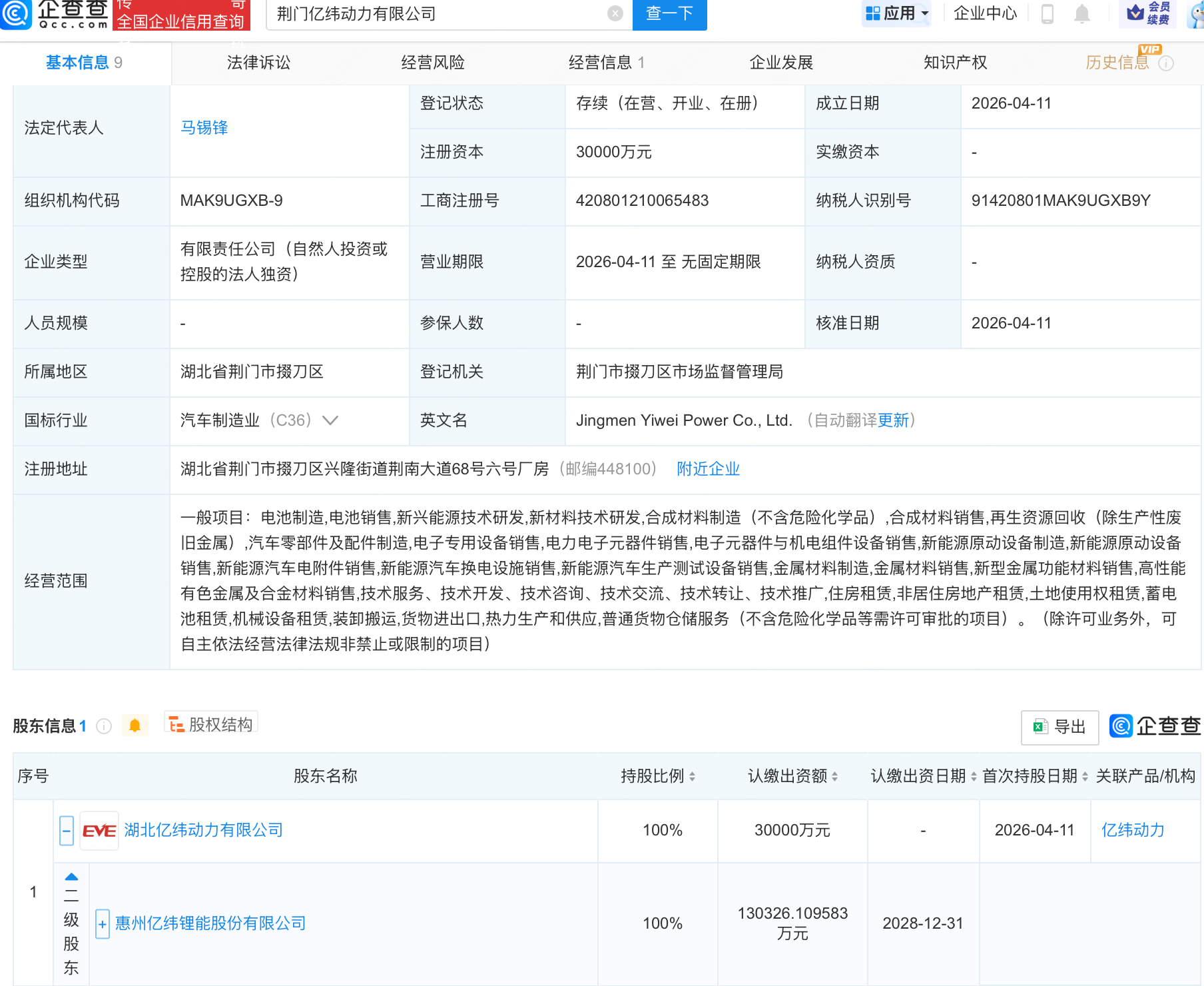 企查查APP显示,近日,荆门亿纬动力有限公司成立,注册资本3亿元,经营范围包含:金属材料制造;金属材料销售;新型金属功能材料销售;高性能有色金属及合金材料销售等。企查查股权穿透显示,该公司由亿纬锂能(300014)间接全资持股。