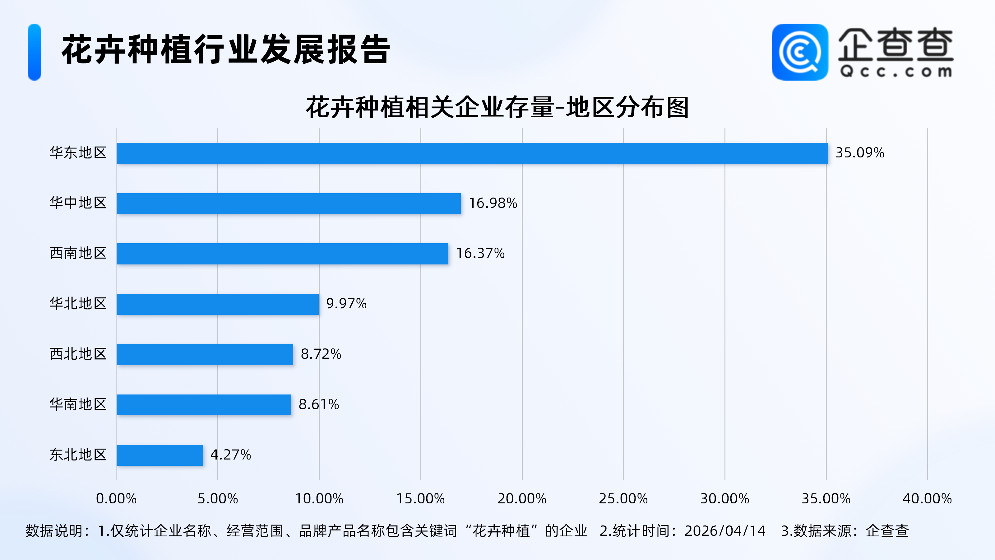 企查查数据显示,花卉种植相关企业多分布在华东地区,占比35.09%。其次,华中、西南地区分别占比16.98%、16.37%。华北、西北、华南、东北地区占比均在10%以下。