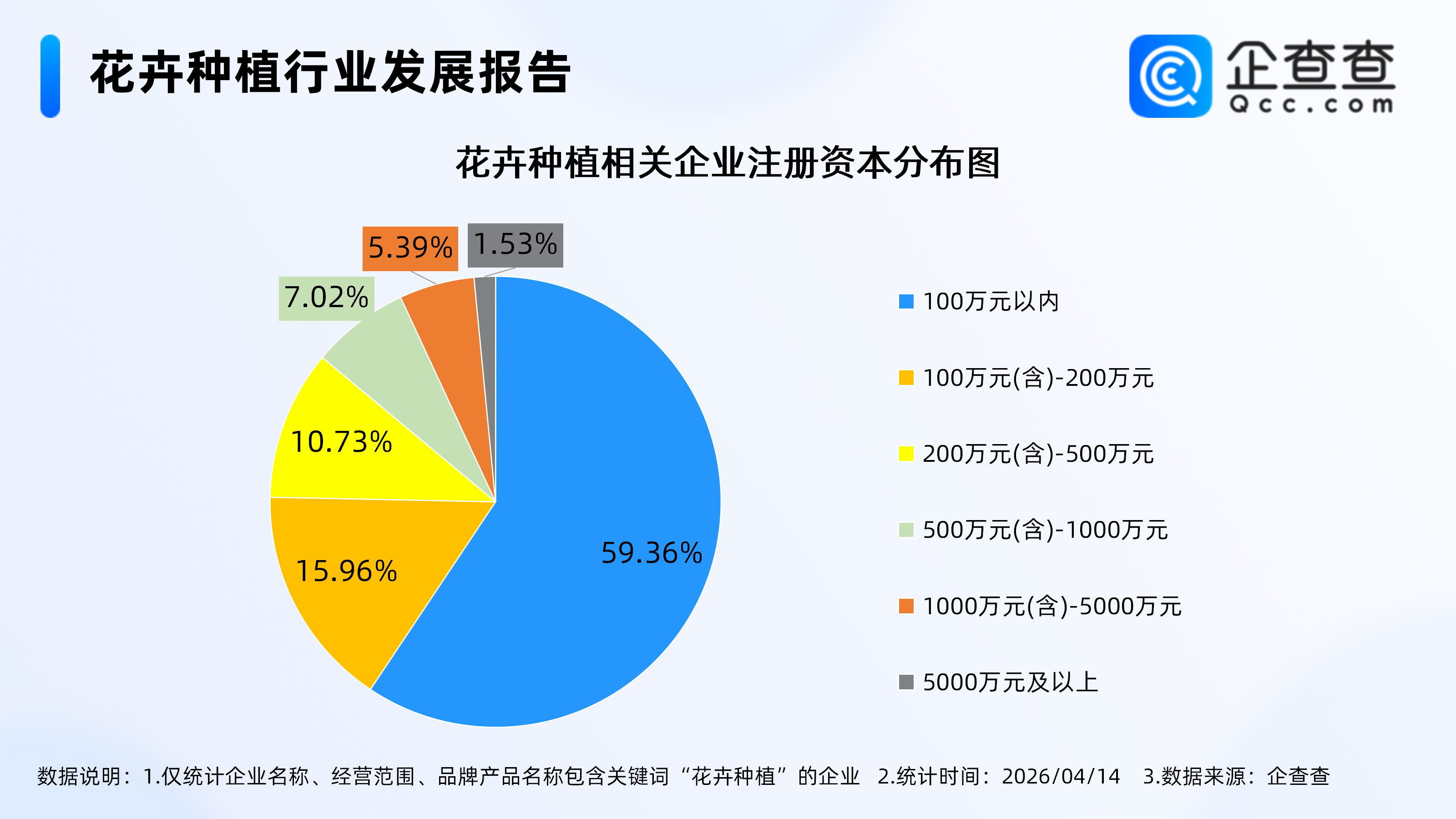 企查查数据显示,从注册资本分布来看,花卉种植相关企业多为轻量级为主,注册资本在100万元以内的企业最多,占比59.36%,其次,注册资本在100万元(含)-200万元的相关企业占比15.96%。注册资本在1000万元及以上的相关企业合计占比6.92%。