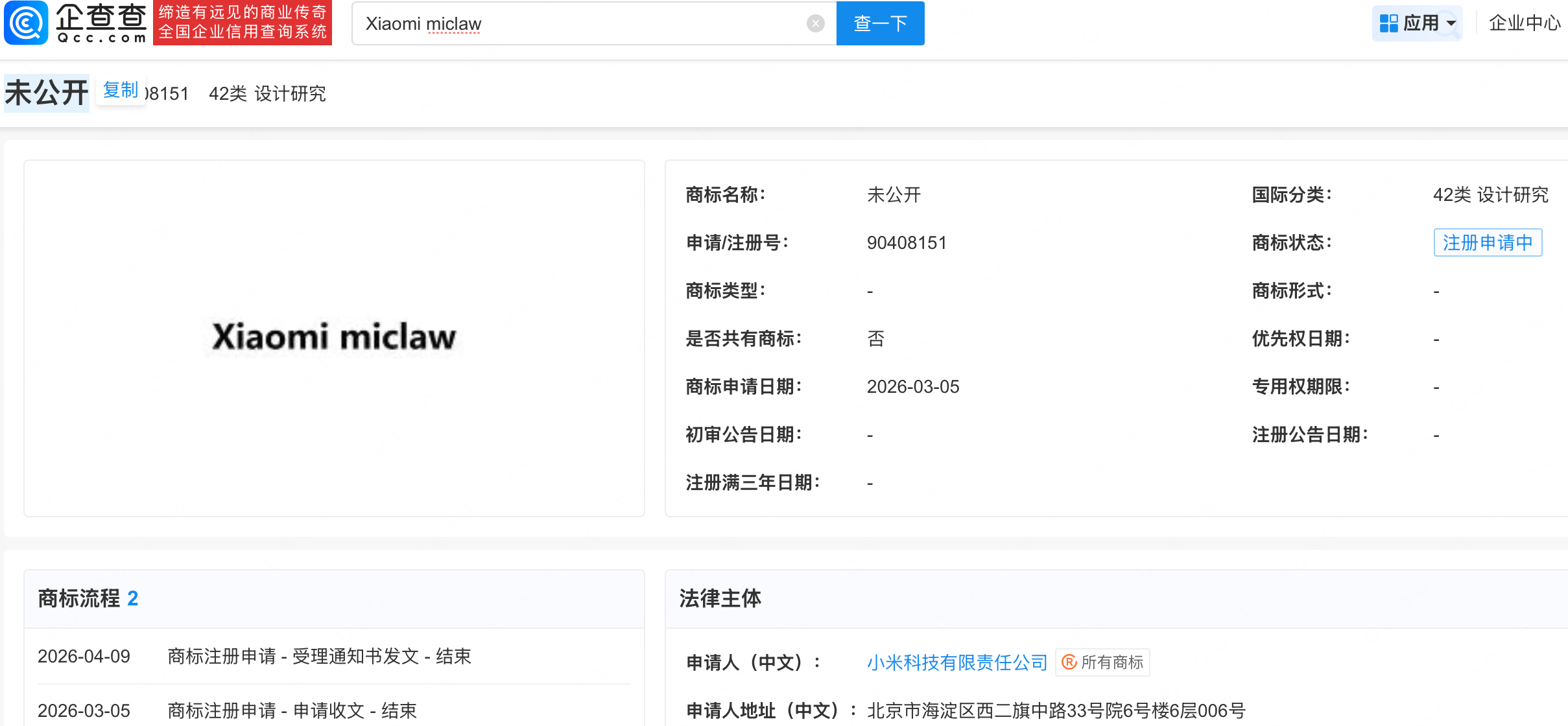企查查APP显示,近日,小米科技有限责任公司申请注册“Xiaomi miclaw”商标,国际分类为科学仪器、设计研究,当前商标状态均为注册申请中。