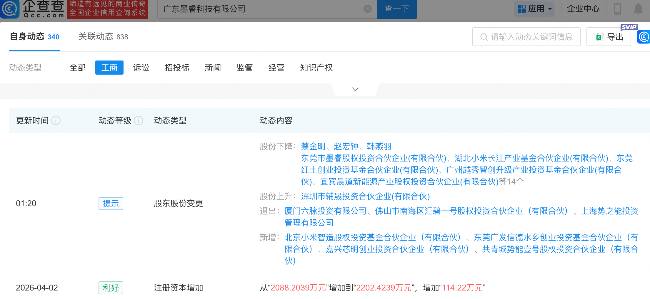 企查查APP显示,近日,广东墨睿科技有限公司发生工商变更,新增北京小米智造股权投资基金合伙企业(有限合伙)等为股东,此前,湖北小米长江产业基金合伙企业(有限合伙)已在该公司持股,同时该公司注册资本增至2202.42万元。企查查信息显示,该公司成立于2015年,经营范围包含:新材料技术研发;石墨及碳素制品制造;石墨烯材料销售;石墨及碳素制品销售等。据其官网,墨睿科技从事于石墨烯等低维纳米材料应用开发。