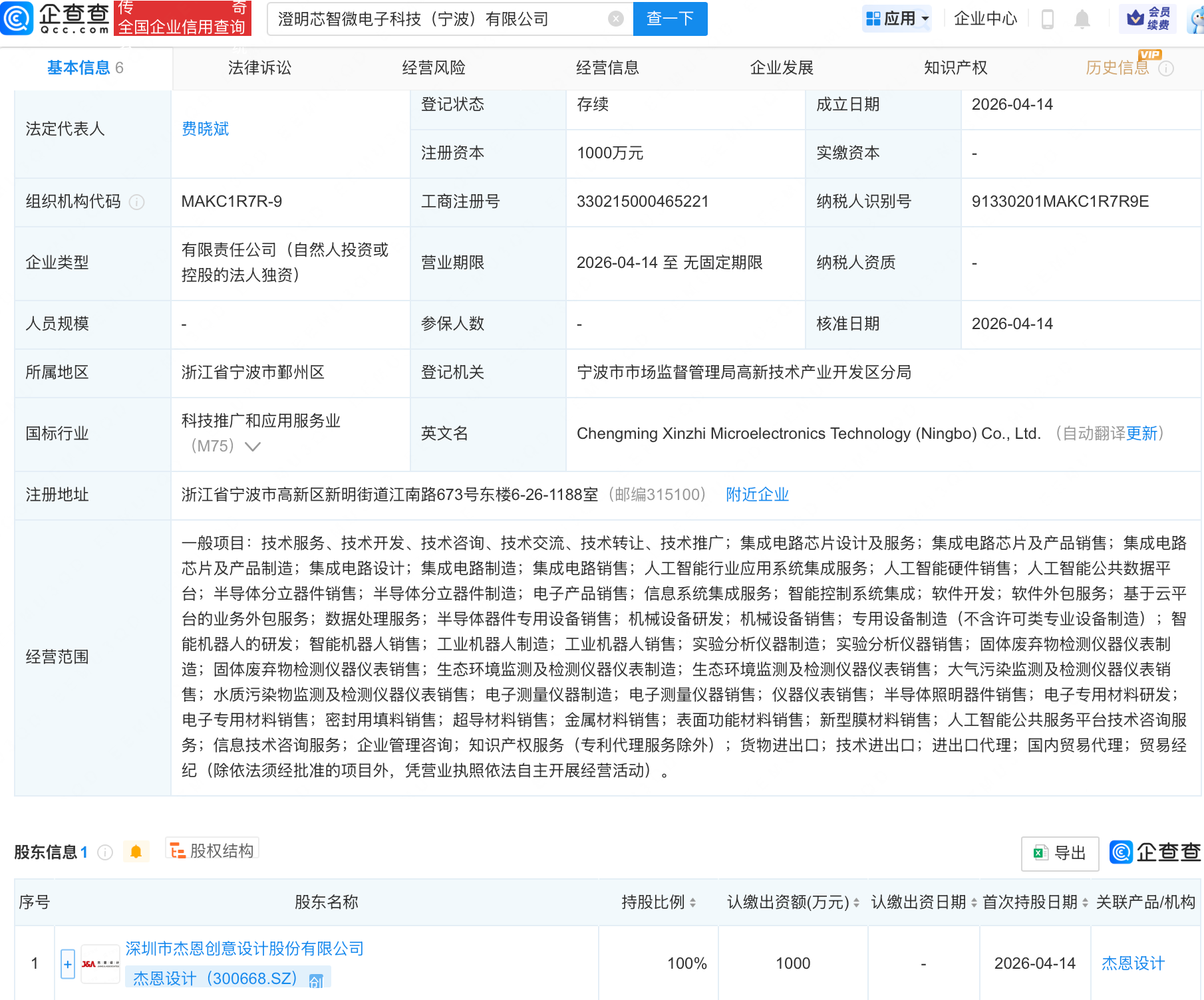 企查查APP显示,近日,澄明芯智微电子科技(宁波)有限公司成立,注册资本1000万元,经营范围包含:集成电路芯片设计及服务;集成电路芯片及产品销售;人工智能行业应用系统集成服务;人工智能硬件销售;人工智能公共数据平台等。企查查股权穿透显示,该公司由杰恩设计(300668)全资持股。