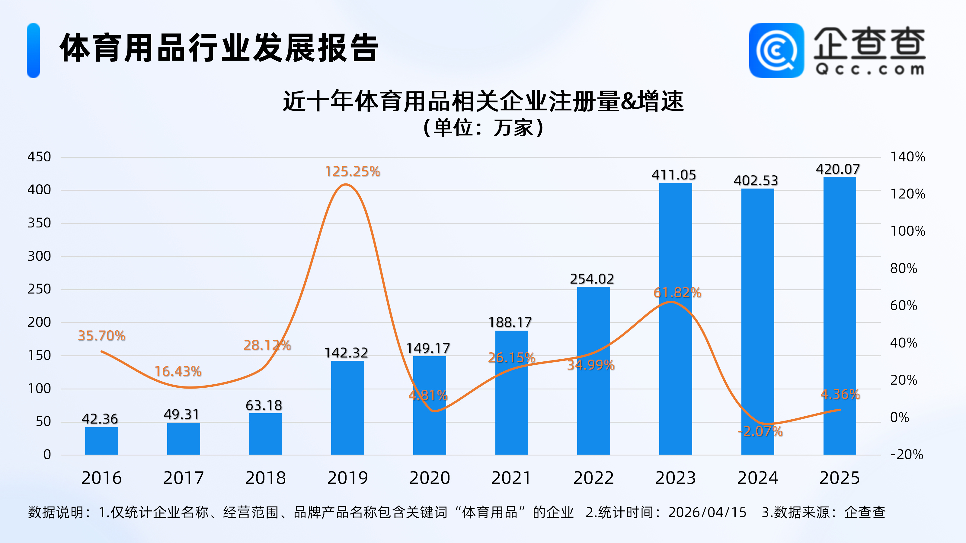 企查查数据显示,截至4月15日,国内现存体育用品相关企业1476.33万家。近十年体育用品相关企业注册量整体呈高速扩张态势,其中2019年全年注册142.32万家相关企业,同比增长125.25%,达近十年注册增速峰值。2025年全年注册420.07万家,同比增长4.36%,创近十年注册量新高。截至目前,今年已注册89.37万家。