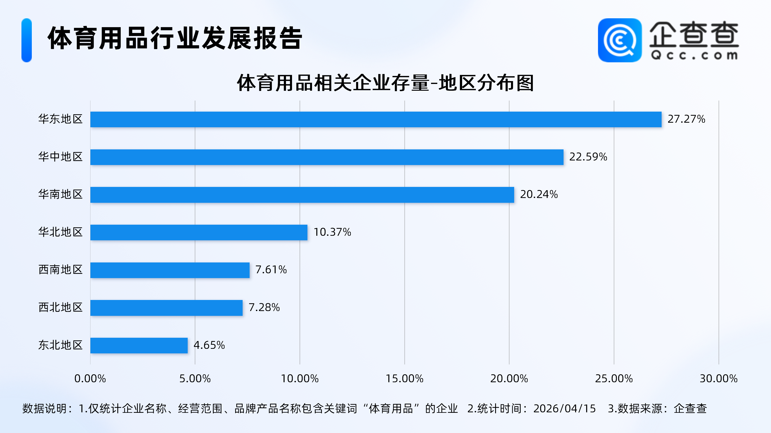企查查数据显示,从地区分布来看,分布在华东地区的体育用品相关企业最多,占比27.27%。其次,分布在华中地区、华南地区的相关企业占比分别为22.59%、20.24%。