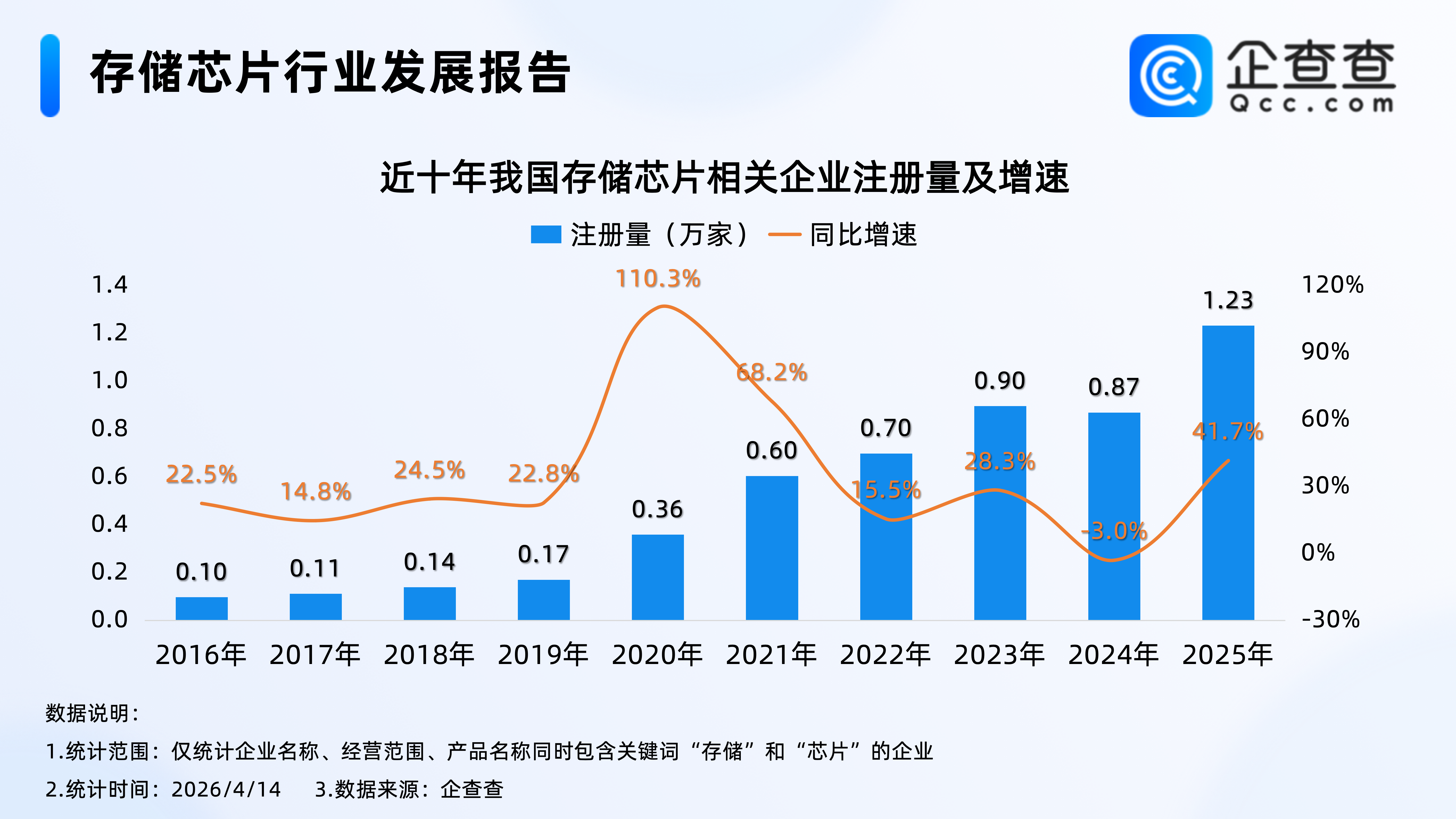 企查查数据显示,近十年,我国存储芯片相关企业注册量基本逐年增加,其中2020年注册量同比大幅增加110.3%至0.36万家,达近十年注册量增速峰值,2025年全年,我国累计注册1.23万家存储芯片相关企业,同比增加41.7%,创近十年相关企业注册量新高。截至4月14日,2026年我国已注册3195家存储芯片相关企业。