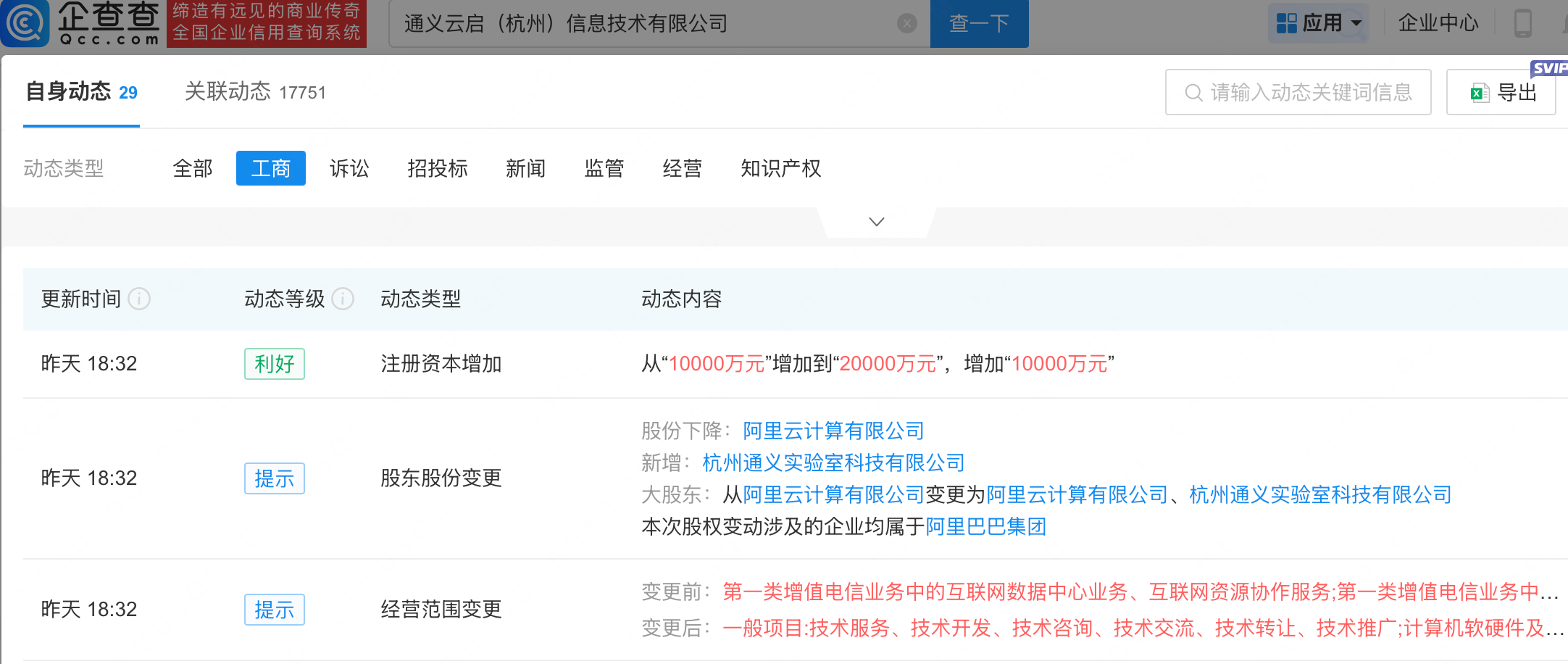 企查查APP显示,近日,通义千问关联公司通义云启(杭州)信息技术有限公司发生工商变更,新增杭州通义实验室科技有限公司为股东,同时,注册资本由1亿元增至2亿元,增幅100%。企查查信息显示, 该公司成立于2018年11月,法定代表人为于文渊,经营范围包括广告制作、计算机软硬件及辅助设备批发、电子产品销售等。