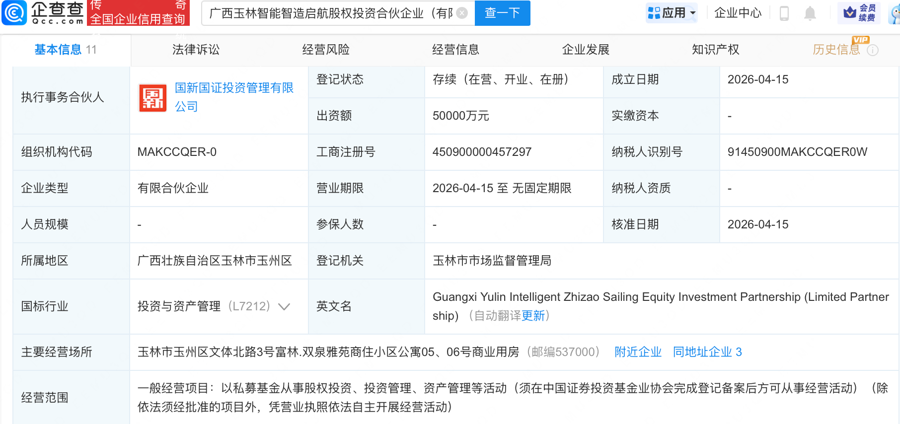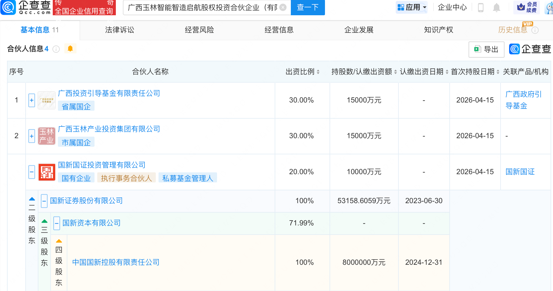 企查查APP显示,近日,广西玉林智能智造启航股权投资合伙企业(有限合伙)成立,出资额5亿元,经营范围包含:以私募基金从事股权投资、投资管理、资产管理等活动。企查查股权穿透显示,该企业由中国国新控股有限责任公司旗下国新国证投资管理有限公司、广西投资引导基金有限责任公司等共同出资。