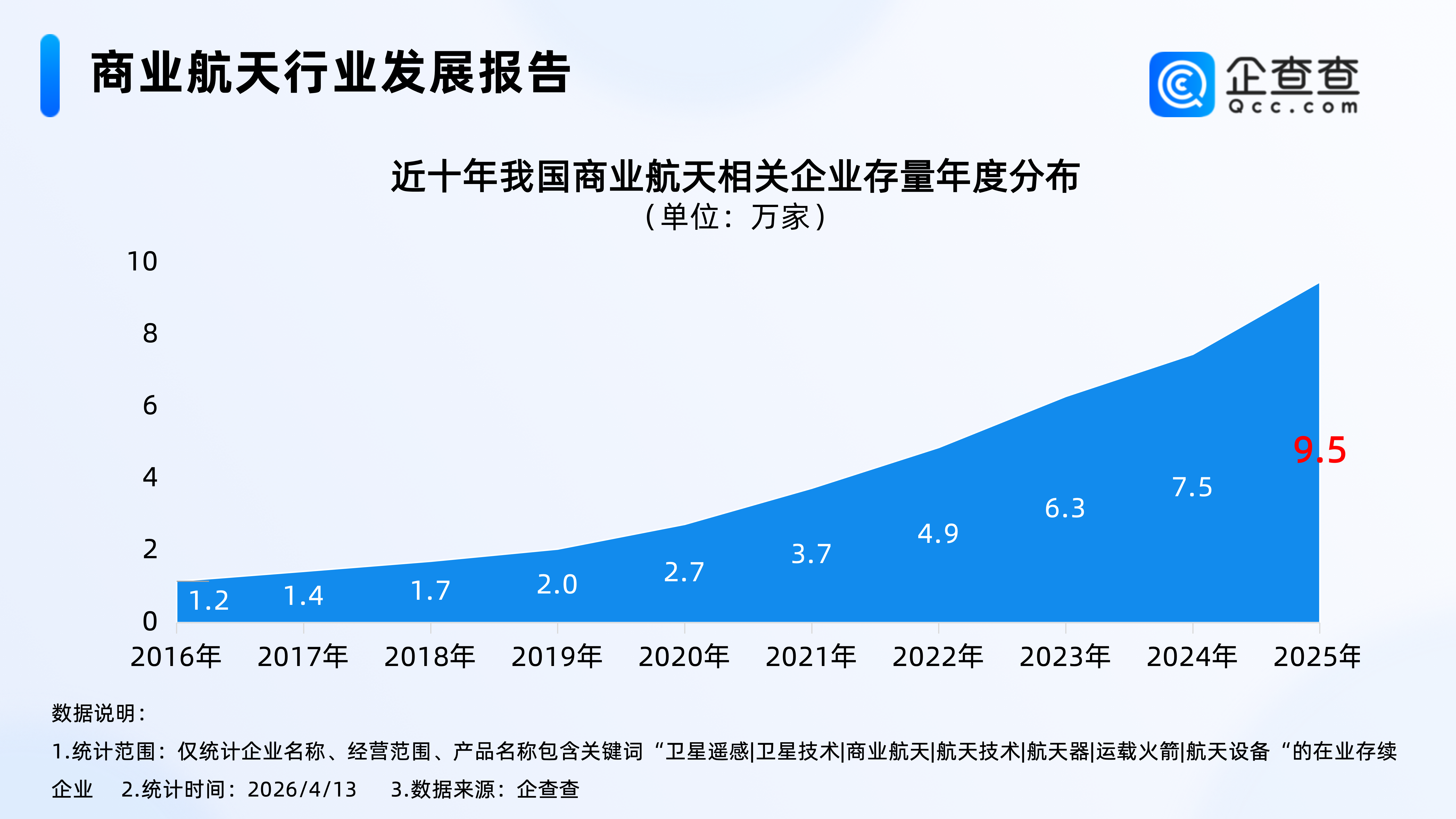 企查查数据显示,近十年,我国商业航天相关企业存量逐年增加,从2021年开始,每年存量增加过万家,2025年年底,我国商业航天行业相关企业存量相比2024年年底增加超2万。截至2026年4月13日,我国现存9.9万家商业航天相关企业。