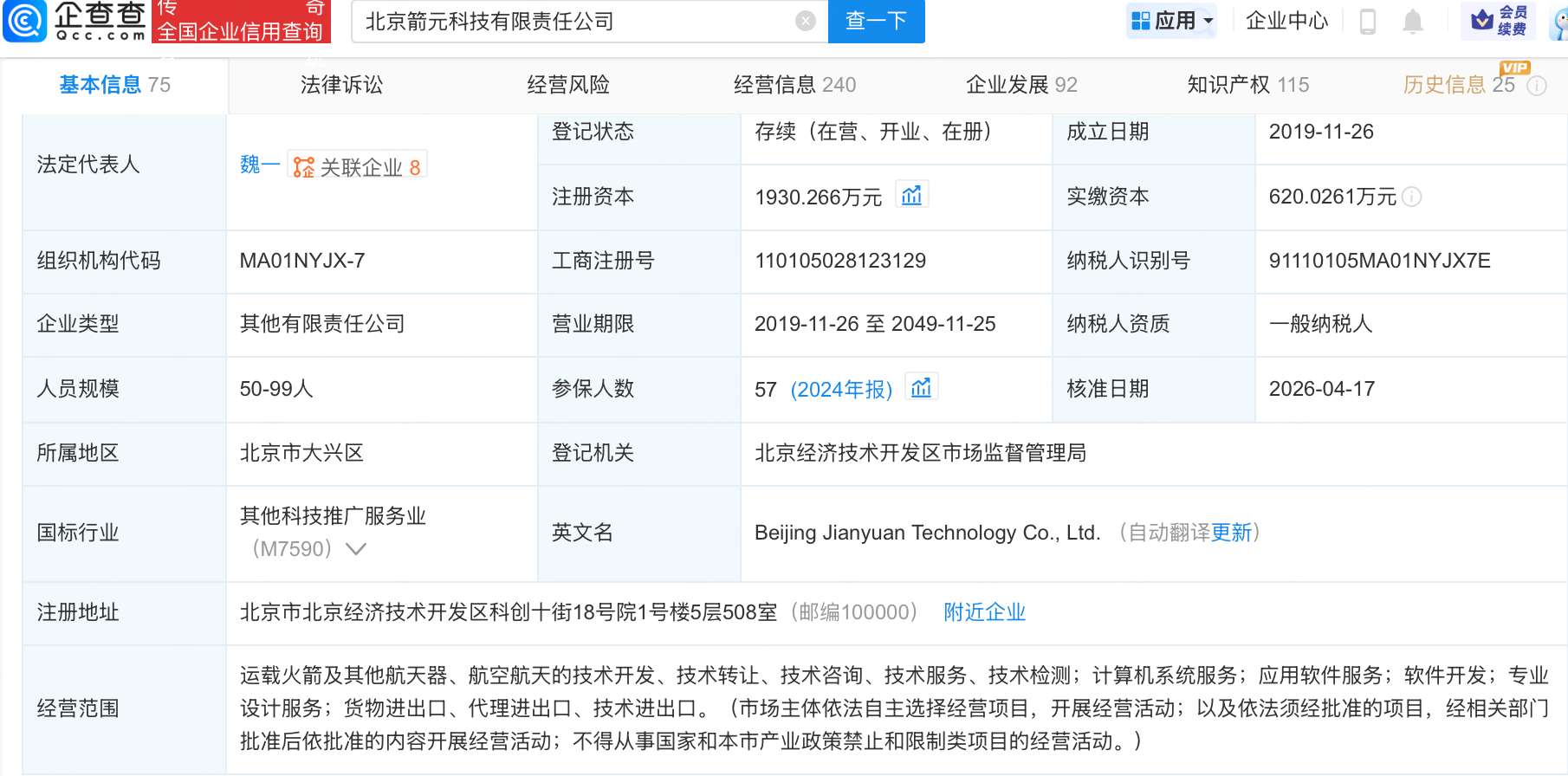 企查查APP显示,近日,北京箭元科技有限责任公司发生工商变更,注册资本由1299.25万元增至1930.27万元。企查查信息显示,该公司成立于2019年,法定代表人为魏一,经营范围包含:运载火箭及其他航天器、航空航天的技术开发、技术转让、技术咨询、技术服务、技术检测等。