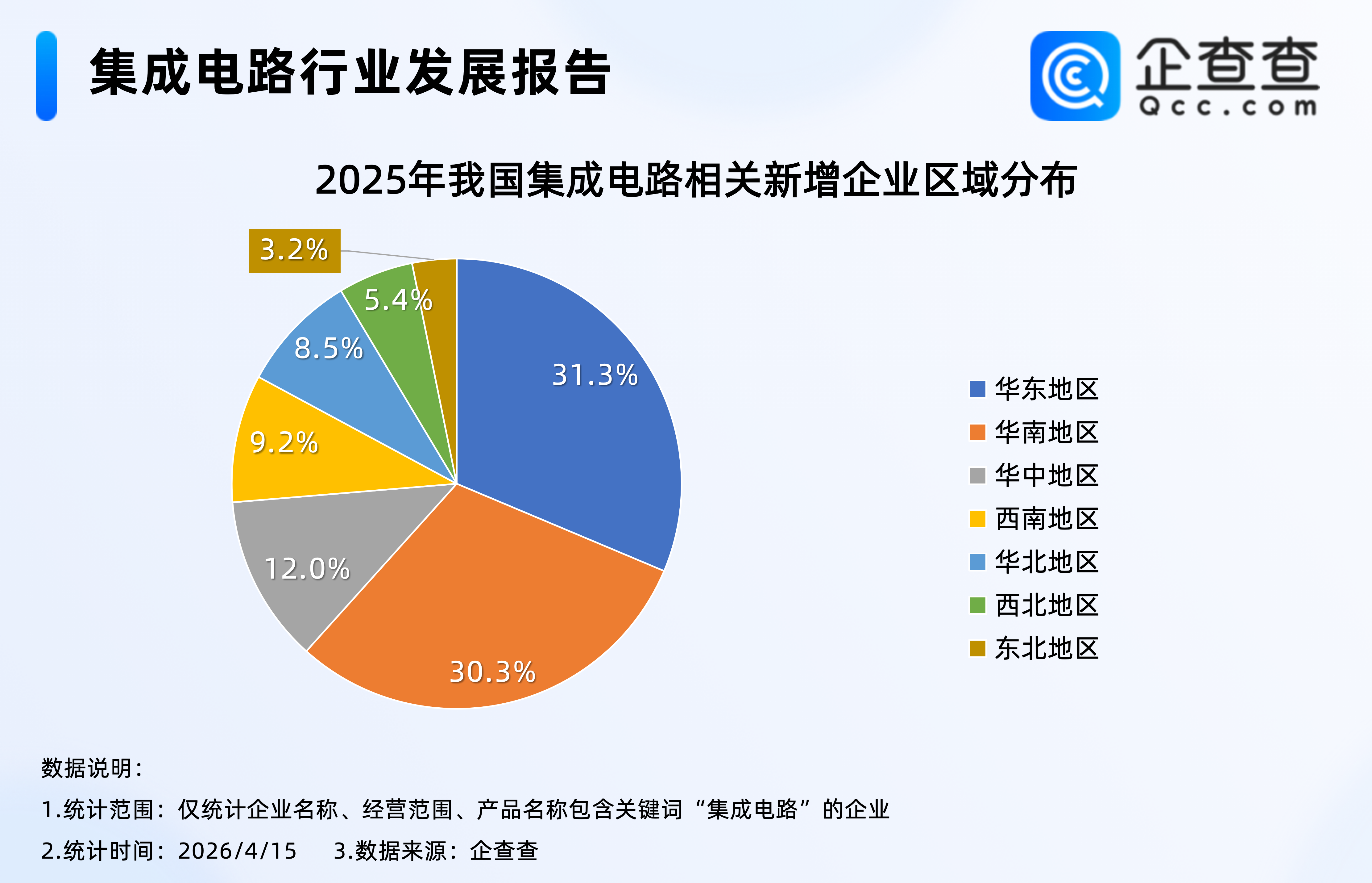企查查数据显示,2025年全年,我国集成电路相关企业注册量同比增加19.8%至16.6万家,创近十年注册量新高,区域分布上,2025年新注册企业中,分布在华东、华南地区的相关企业合计占比超六成,其中华东地区占比31.3%;截至4月15日,2026年我国已注册超4万家集成电路相关企业。企业存量方面,截至2026年4月15日,我国现存近84万家集成电路相关企业。