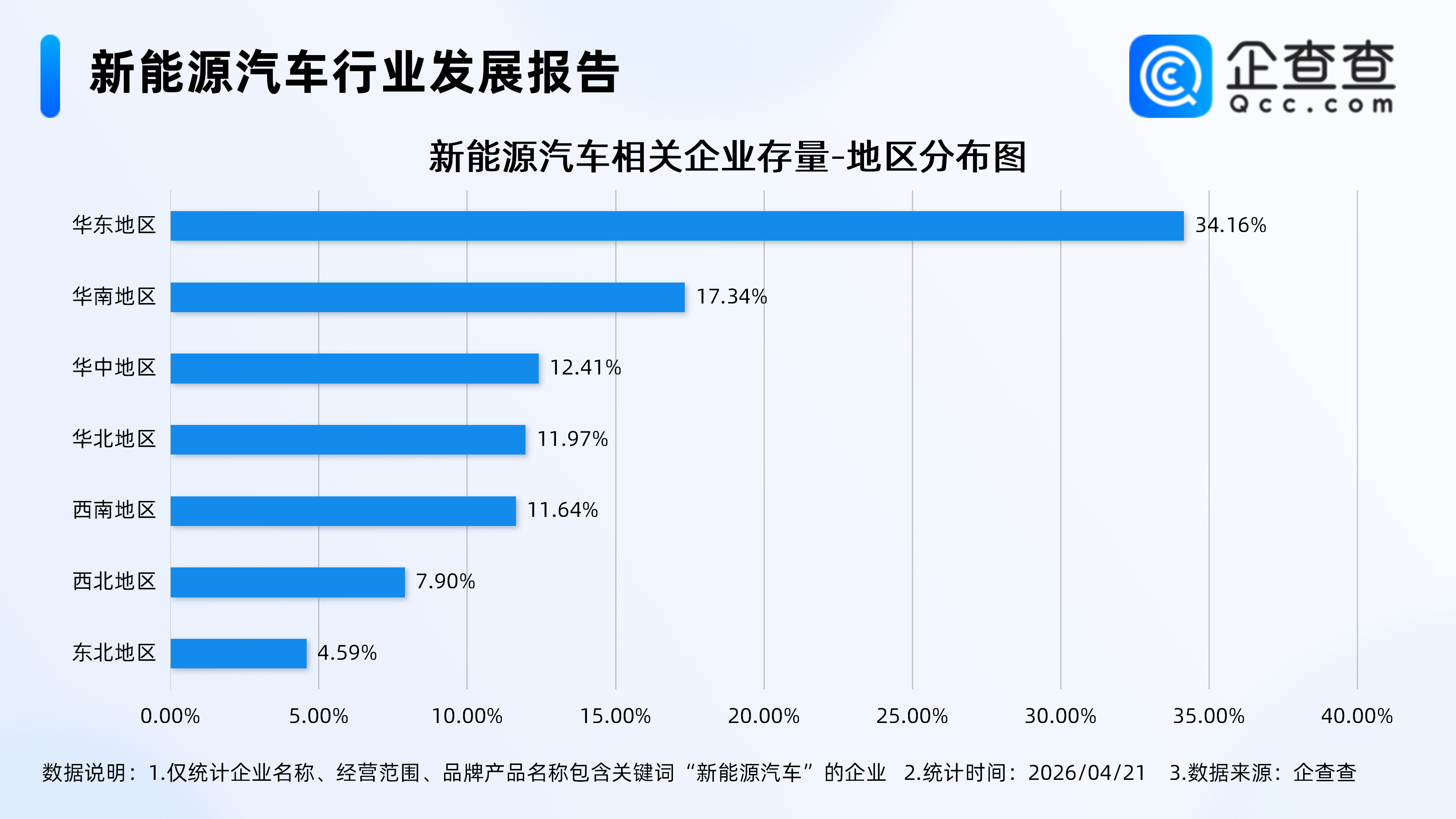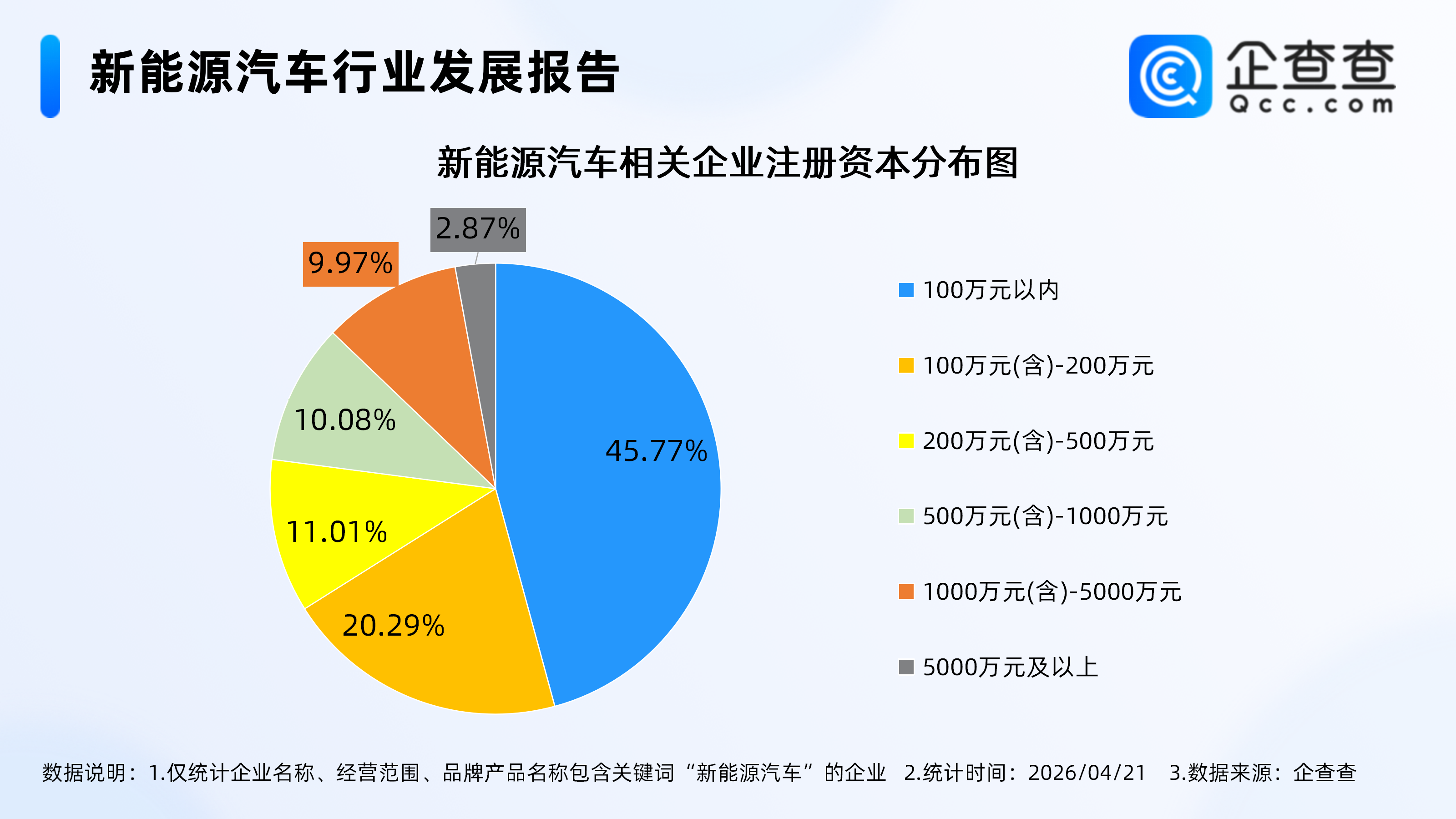 企查查数据显示,截至4月21日,国内现存新能源汽车相关企业153.46万家。注册量方面,近十年相关企业注册量呈整体增长态势,2025年全年注册33.4万家相关企业,同比增长5.12%,创近十年注册量新高。截至目前,今年已注册8.07万家相关企业。存量方面,从注册资本来看,新能源汽车相关企业多为轻量级企业,注册资本在200万元以内的企业合计占比超六成。从地区分布来看,分布在华东地区的相关企业最多,占比34.16%。