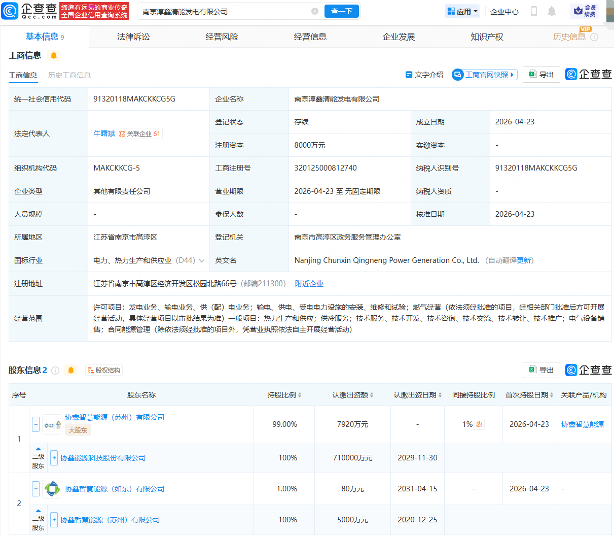 企查查APP显示,近日,南京淳鑫清能发电有限公司成立,法定代表人为牛曙斌,注册资本为8000万元,经营范围包含:发电业务、输电业务、供(配)电业务;热力生产和供应;供冷服务;电气设备销售等。企查查股权穿透显示,该公司由协鑫能科(002015)旗下协鑫智慧能源(苏州)有限公司、协鑫智慧能源(如东)有限公司共同持股。