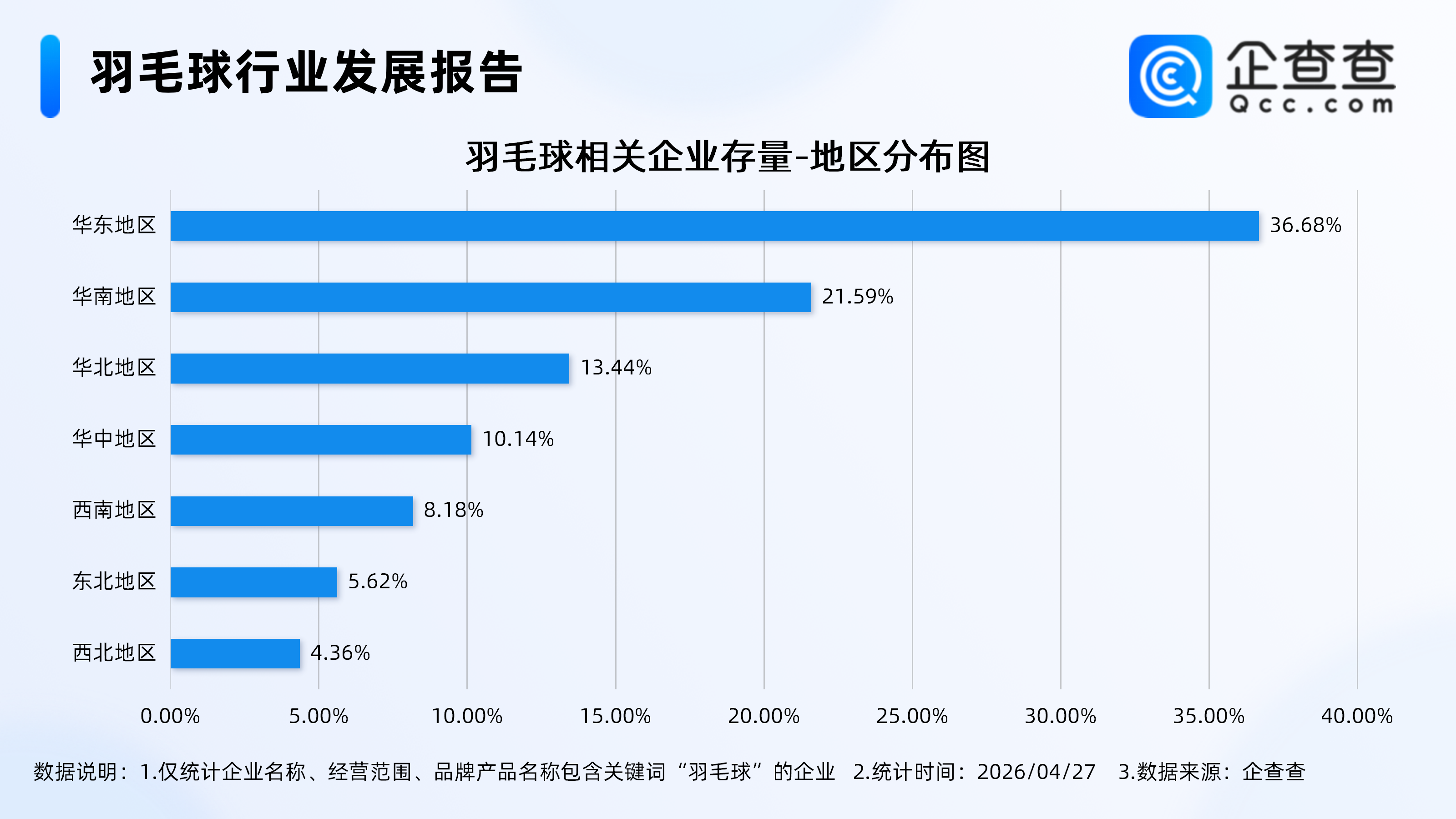 企查查数据显示,地区分布上,羽毛球相关企业具有明显的地域集中性。分布在华东地区的相关企业最多,占比达36.68%;华南地区次之,占比21.59%;华北地区占比13.44%;华中地区占比10.14%;西南地区占比8.18%;东北地区占比5.62%;西北地区占比最低,为4.36%。