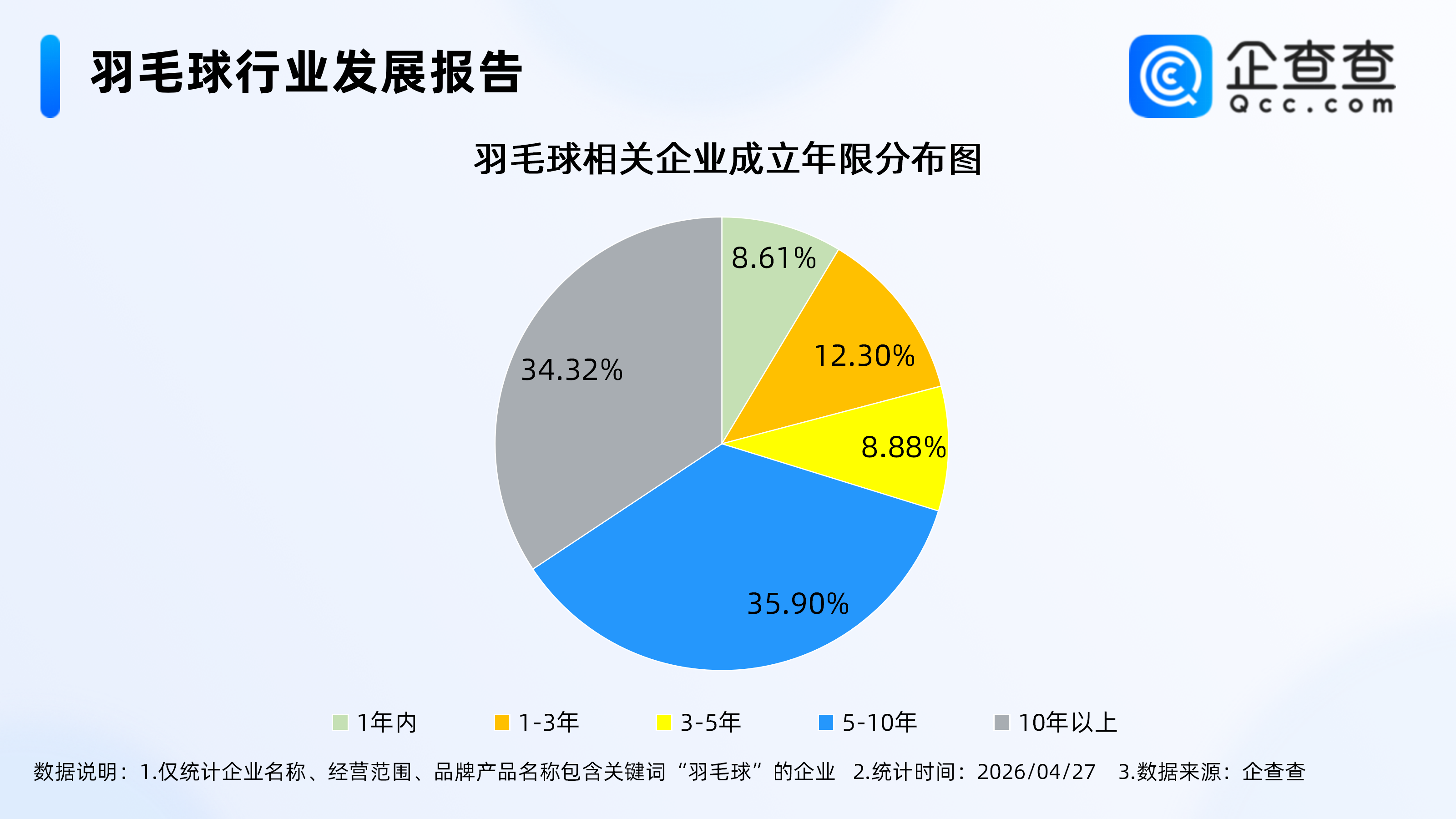 企查查数据显示,截至4月27日,国内现存羽毛球相关企业1.34万家。注册量方面,近五年羽毛球相关企业注册量呈现先小幅波动后持续增长的态势,2025年注册量大幅增长至1279家,同比增速36.35%,为近五年注册增速峰值。截至目前,今年已注册242家相关企业。存量方面,地区分布上,羽毛球相关企业具有明显的地域集中性,分布在华东地区的相关企业最多,占比达36.68%。成立年限方面,羽毛球相关企业多以成熟企业为主,成立年限在5-10年的相关企业最多,占比35.90%。