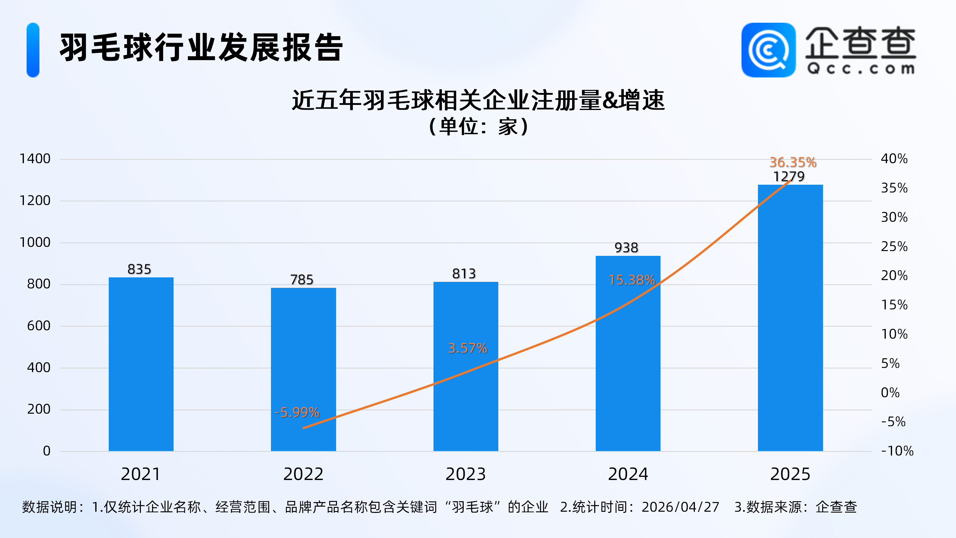 企查查数据显示,截至4月27日,国内现存羽毛球相关企业1.34万家。近五年羽毛球相关企业注册量呈现先小幅波动后持续增长的态势,2021年注册量为835家;2022年注册量同比下降5.99%,至785家;2023年注册量回升至813家,同比增速3.57%;2024年注册量达938家,同比增速15.38%;2025年注册量大幅增长至1279家,同比增速36.35%,为近五年注册增速峰值。截至目前,今年已注册242家相关企业。
