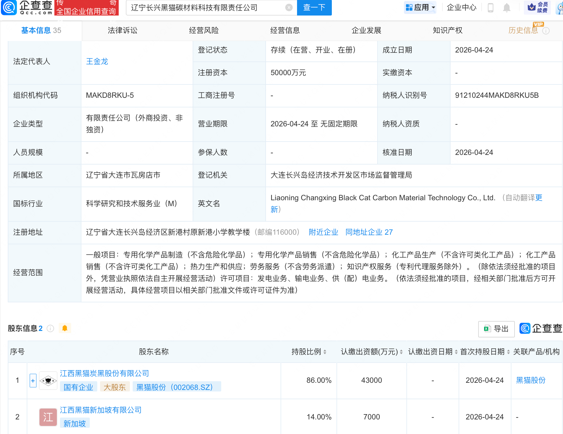 企查查APP显示,近日,辽宁长兴黑猫碳材料科技有限责任公司成立,注册资本5亿元,经营范围包含:热力生产和供应;劳务服务(不含劳务派遣);知识产权服务(专利代理服务除外)等。企查查股权穿透显示,该公司由黑猫股份(002068)等共同持股。